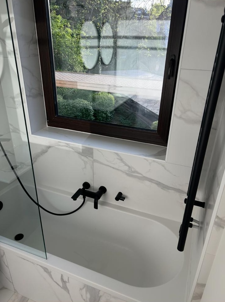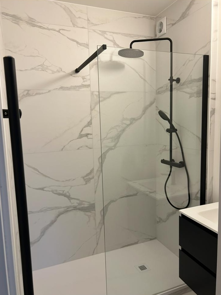 Notre entreprise réalise tous vos travaux de salle de bain: sols, murs, plafonds, peinture, carrelage, joints silicones, installation des équipements sanitaires (baignoire, douche, toilette, évier).